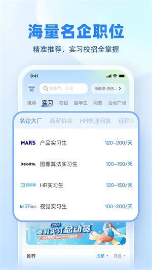 实习僧app是一款专门为广大求职者提供的职业招聘软件。该软件以“职业技能服务”为基础,整合了各行各业的优质招聘内容及岗位信息,提供丰富的线上线下职位搜索、在线简历投递和面试申请等便捷功能;同时还汇集行业名企招聘信息与人才资源,并可根据用户的需求个性化定制专业化的招聘解决方案。不仅如此,实习悟app也是一个全面而专业的求职应用,在这里你可以快速找到心仪的工作机会,包括全职工作,兼职工作,还是实习生专属福利活动应有尽有,让你轻松享受到高薪offer带来的愉悦感!欢迎有兴趣的用户们前来本站下载使用哦。