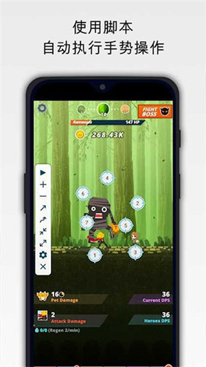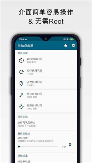全自动操纵杆,一键设置:支持屏幕自动点击,并且具有自动滑动、多任务同时完成、定时关闭等功能。