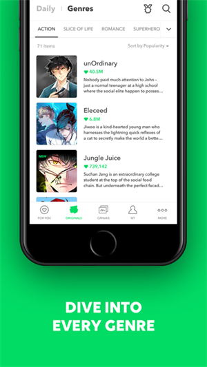 webtoon漫画app是一个很不错的看漫画阅读平台,这款软件中有很多漫画作品可以选择进行观看哦,大家可以在手机上免费浏览全网最新最热漫画资源。而且WebTok漫画支持离线缓存、分享功能等操作哟,快来下载使用吧!