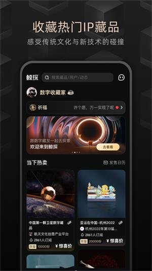 鲸探app安卓手机版是一款安卓手机上免费数字收藏品交易平台,软件中有着海量的优质藏品等你浏览体验,用户可以在线选购自己喜欢的藏品资源进行鉴赏哦,超多藏品分类栏目满足你的购买需求,对游戏竞技类游戏感兴趣的话不妨点击下载试一试!